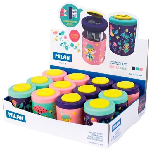 Sacapuntas doble (uno estándar y otro MAXI) con depósito. Diseño COLLECTION, edición especial FAIRY TALE. Cómodo tapón con rosca. El sacapuntas tiene una cuchilla de acero al carbono afilada y resistente, ideal para todo tipo de lápices. Artículo con cuchilla de seguridad. Este sistema evita que se pueda separar la hoja del cuerpo del sacapuntas, siendo óptimo para uso escolar. Colores surtidos disponibles: violeta, verde y rosa. Diseño original creado por el departamento de I+D de MILAN.