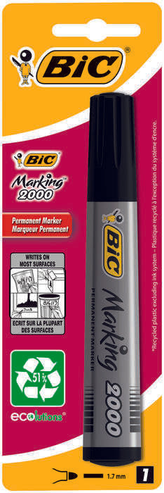El BIC Marking 2000 ECOlutions es un marcador permanente de larga duración y secado rápido que puede dejarse sin tapar hasta un mes. Fabricado en Francia, este marcador permanente eco-diseñado está hecho de 51% de materiales reciclados (sin incluir el sistema de tinta). Puntas de 1,7 mm La punta de la bala de acrílico es resistente a la presión y puede enfrentarse incluso a los entornos de trabajo más duros, ofreciendo un ancho de línea de 1,7 mm Una tinta de alta calidad Su tinta de alta calidad, a base de alcohol, disponible en negro, azul, rojo y verde, es de bajo olor, resistente a la decoloración y seca rápidamente una vez aplicada a cualquier superficie en la que se escriba. Escribe donde necesites en la oficina o en el lugar de trabajo, en la mayoría de las superficies: papel, cartón, plástico, metal o madera... Características: -Trazo de 1.7 mm -Secado rápido -Larga duración. -Para prácticamente todo tipo de superficies. -Hecho en un 51% de materiales reciclados. Especificaciones: -Blister de 1ud