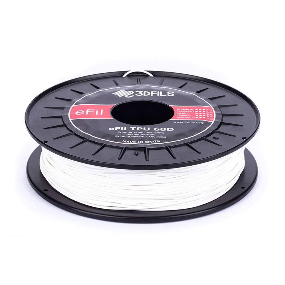 eFil TPU 60D pertenece a la familia eFil de filamentos flexibles basados en TPU. Su dureza es Shore 60D, superior a la dureza estándar de los filamentos flexibles para impresión 3D del mercado. La dureza 60D es la que podemos encontrar en piezas de goma dura, además de contar con más elongación. Esta mayor dureza permite trabajar con filamentos flexibles con la ventaja de una mayor facilidad de impresión.