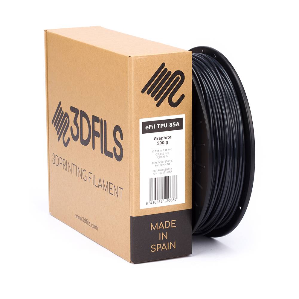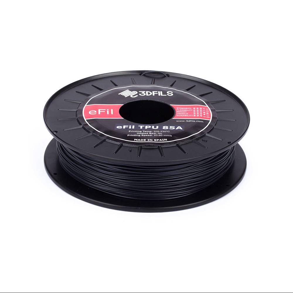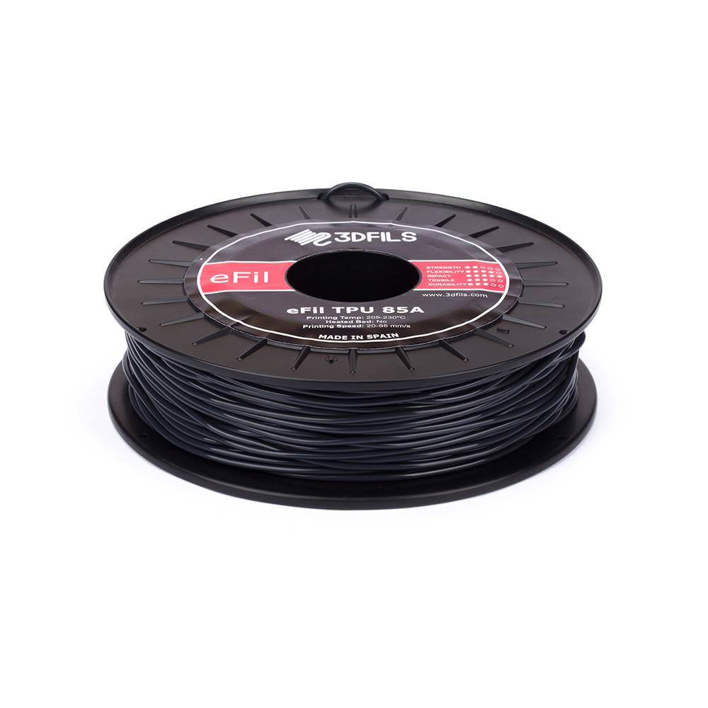 eFil TPU 85A pertenece a la familia eFil de filamentos flexibles basados en plástico TPU. Su dureza es Shore 85A, similar a la que podemos encontrar en el tacón de un zapato. Este filamento está recomendado para usuarios avanzados, ya que requiere una mayor curva de aprendizaje que con materiales más duros, pero vamos a ser capaces de alcanzar elongaciones del 520%. Su flexibilidad lo hace idóneo para aplicaciones en las que se necesiten materiales elásticos con muy buena recuperación. Además, podremos obtener diferentes grados de dureza variando el porcentaje de relleno durante la impresión 3D.